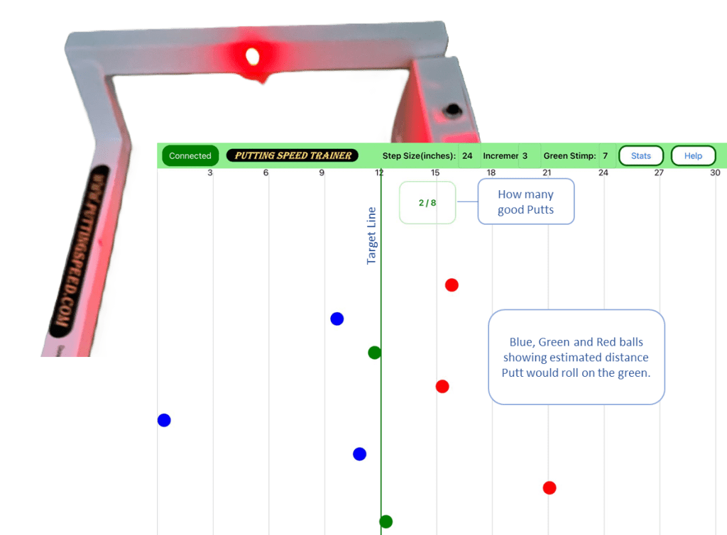 6. Select the target distance in the app, for example, 12 steps, by clicking on the gray line; it will change to green. Put the ball through the device. The LED on the device will show blue, green, or red, depending on whether the speed of the putt is too slow, correct, or too fast, respectively. The app will also display the estimated distance the putt would roll on a level putting green.