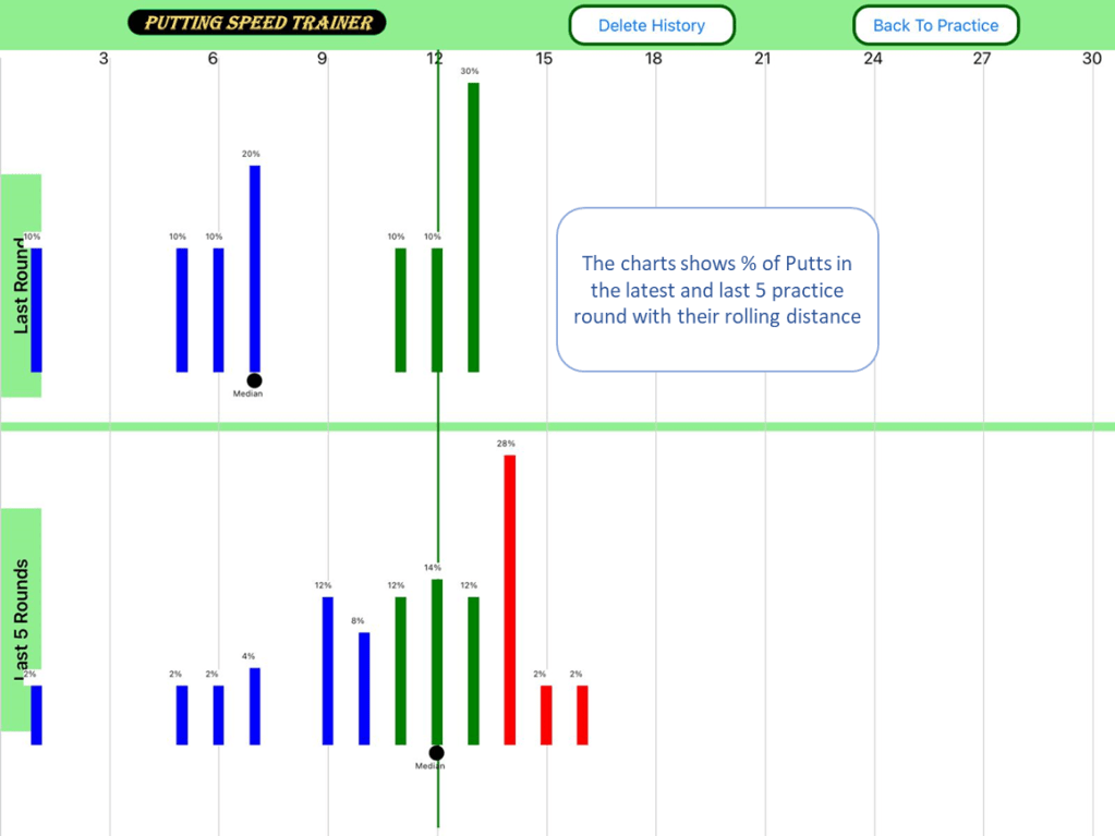 7. The stats section of the app displays the progress of putting distance practice, along with the median distance for each target distance. It also shows the percentage of strokes with slow or fast putts, enabling the player to make corrections in the next practice round.